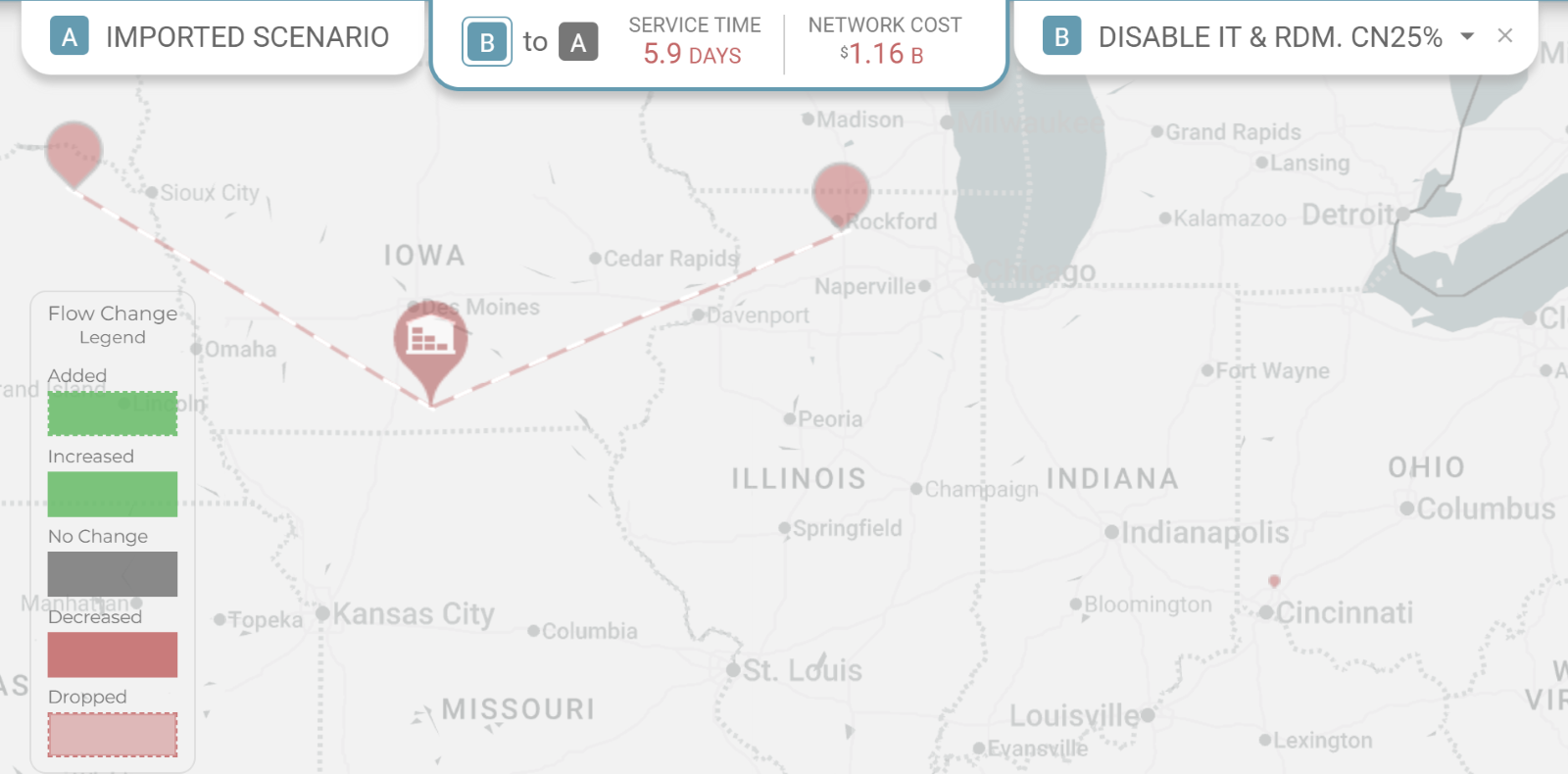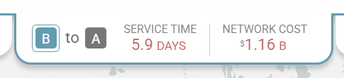 Clicking on each scenario tab will flip flop between the scenarios and also see key metrics in the center tab.  Currently these show differences in service and cost.  The direction of change is represented by the arrow in the center tab.  An arrow from A to B means “how did flow in A change relative to B”. In this example, A has a higher cost than B, the scenario to which it is being compared. Clicking on each scenario tab will flip flop between the scenarios and also see key metrics in the center tab.  Currently these show differences in service and cost.  The direction of change is represented by the arrow in the center tab.  An arrow from A to B means “how did flow in A change relative to B”. In this example, A has a higher cost than B, the scenario to which it is being compared.
