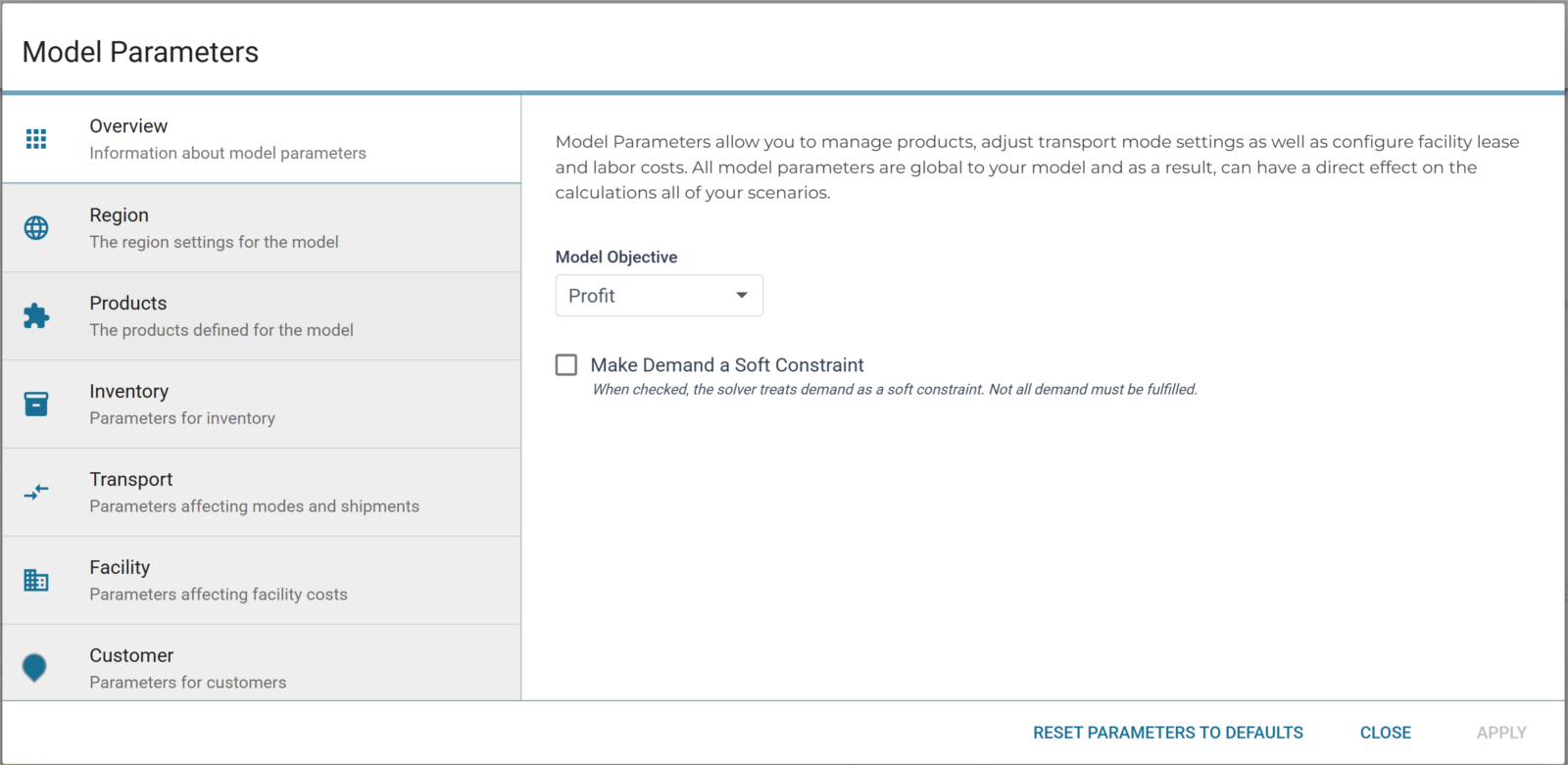 Model Parameters: Model Parameters configuration dialog now allows users to set Model Objective in the overview section as well as enable/disable Soft Demand Constraints (when performing any type of solve operation). In case some customer demand is not profitable to fulfill; users can opt out of meeting the demand by choosing this option.