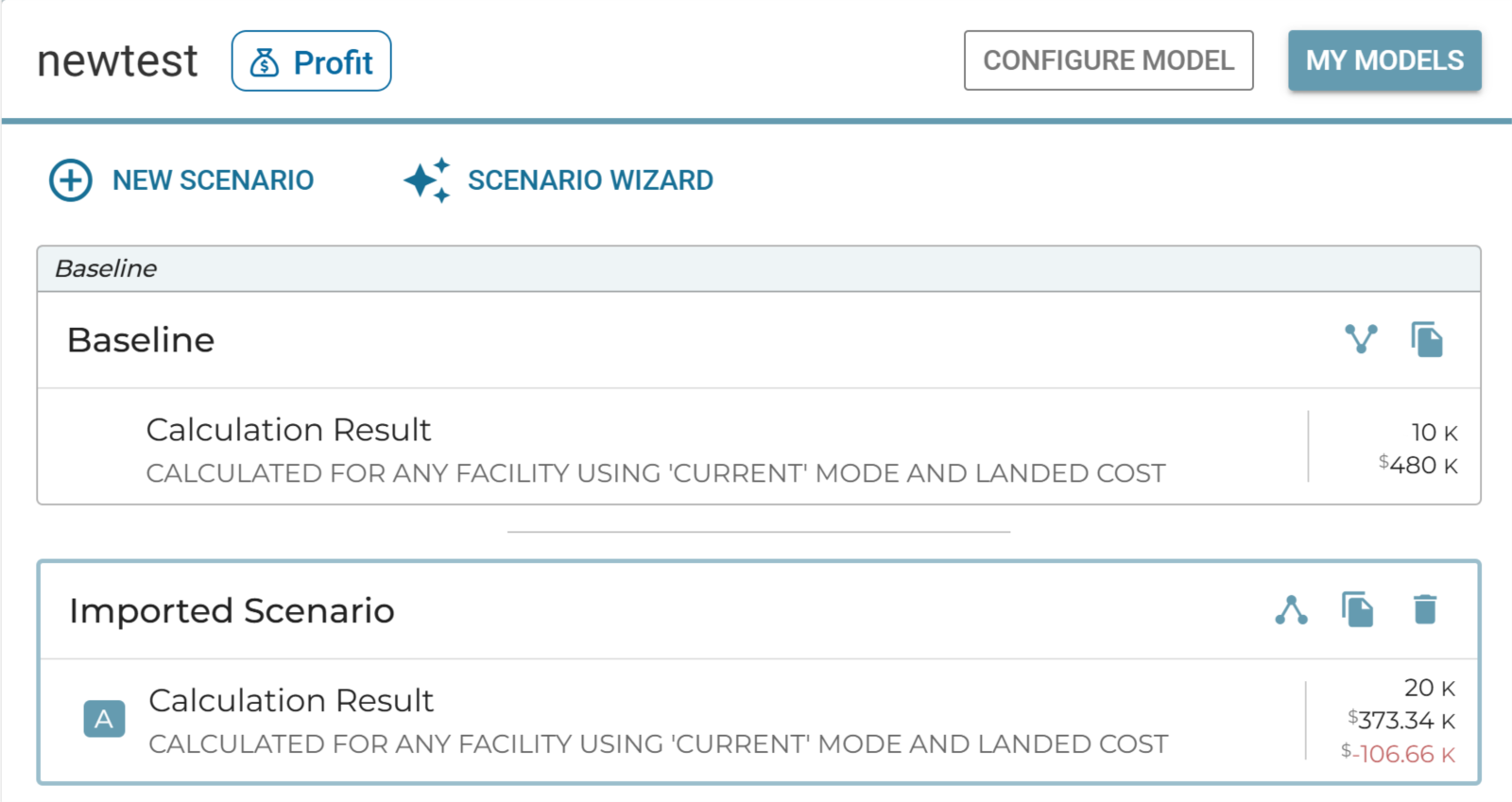 Once a baseline is selected, scenario scoreboard would show the baseline delta cost. This information is also available next to each scenario at the scenario list, together with total flow, network cost, from top to bottom.