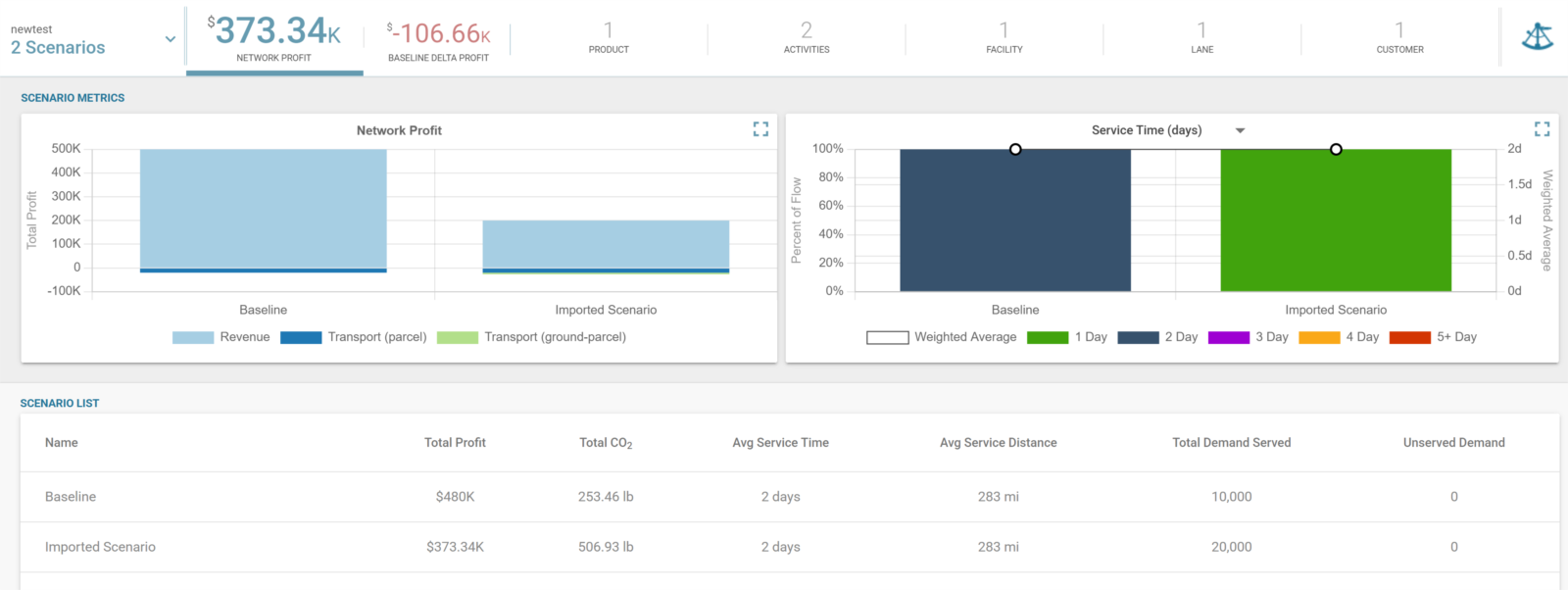 Scoreboard & Scenario Metrics: Once “Profit” is chosen as model objective, we will also see consistent titles throughout the scoreboard and scenario metrics graphs. For instance, instead of “Network Cost”, “Network Profit” will appear as the title. Similarly, we will see “Total Profit” instead of “Total Cost” in the scenario metrics graphs.